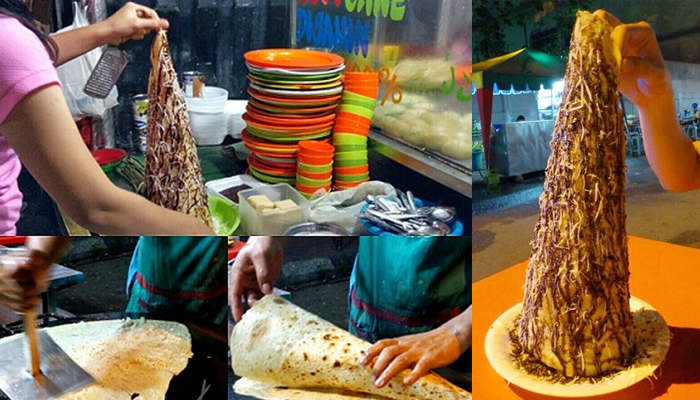 Konon, kuliner kaki lima ini di kenal di warung mamak Malaysia yang dikenal dengan nama roti helikopter dan roti KLCC. Uniknya, bentuk dari makanan ini seperti menara yang tingginya sekitar 30 cm dan disajikan diatas piring yang bertabur coklat dan keju. Dan ternyata, bahan dari Roti Tissue Gapa ini juga sederhana, loh! Hanya dengan adonan roti canai yang dibentuk roti tissue yang tinggi.