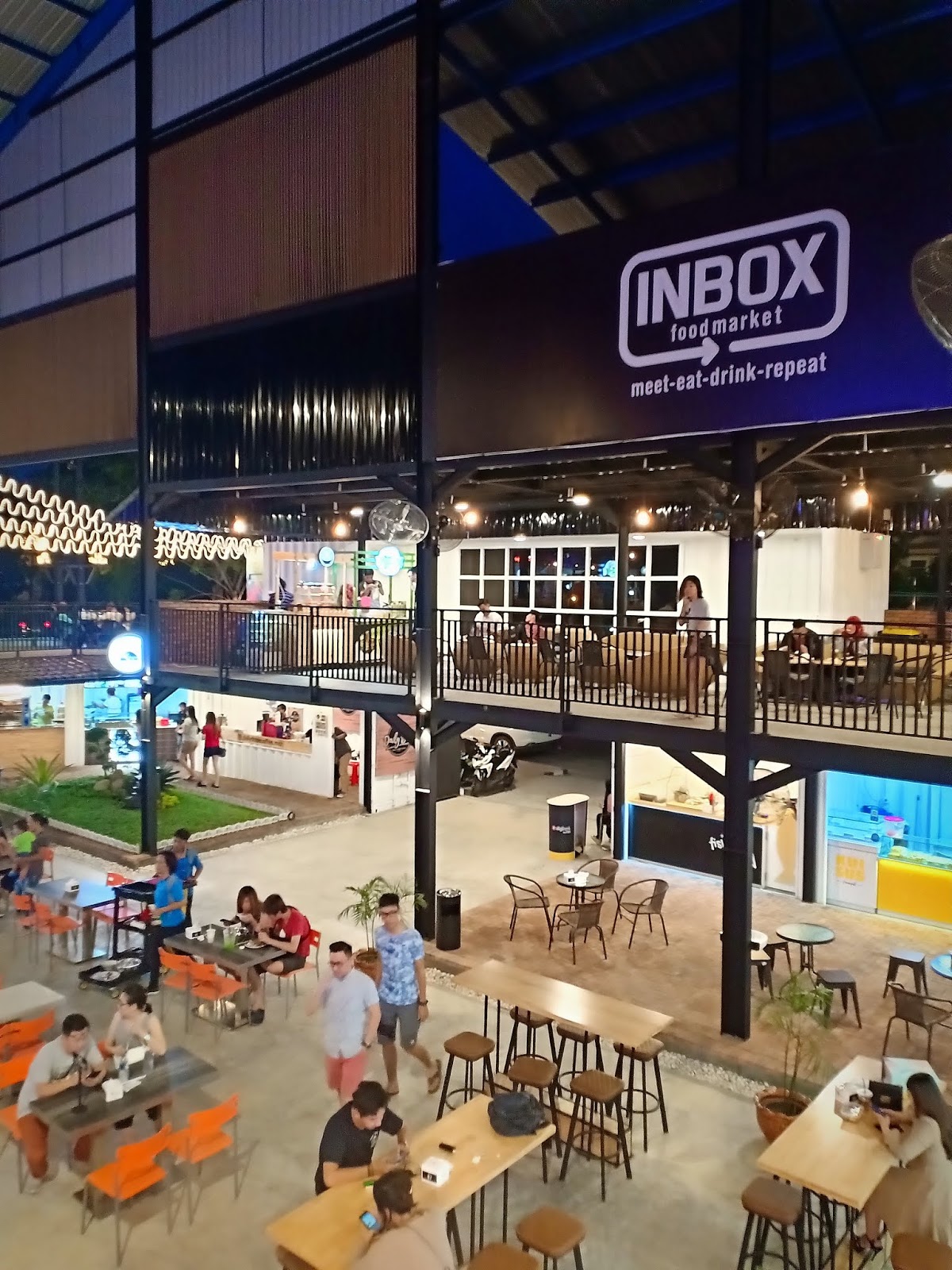 Langkah pertama saat masuk ke INBOX, anda akan disambut oleh beberapa vendor makanan di kiri dan kanan. Kemudian akan mendapati jajaran meja dan bangku yang rapi di tengah-tengah ruangan yang luas. Anda bisa bebas memilih tempat duduk dan berfoto dimana saja. Food market ini juga terdiri dari dua lantai.